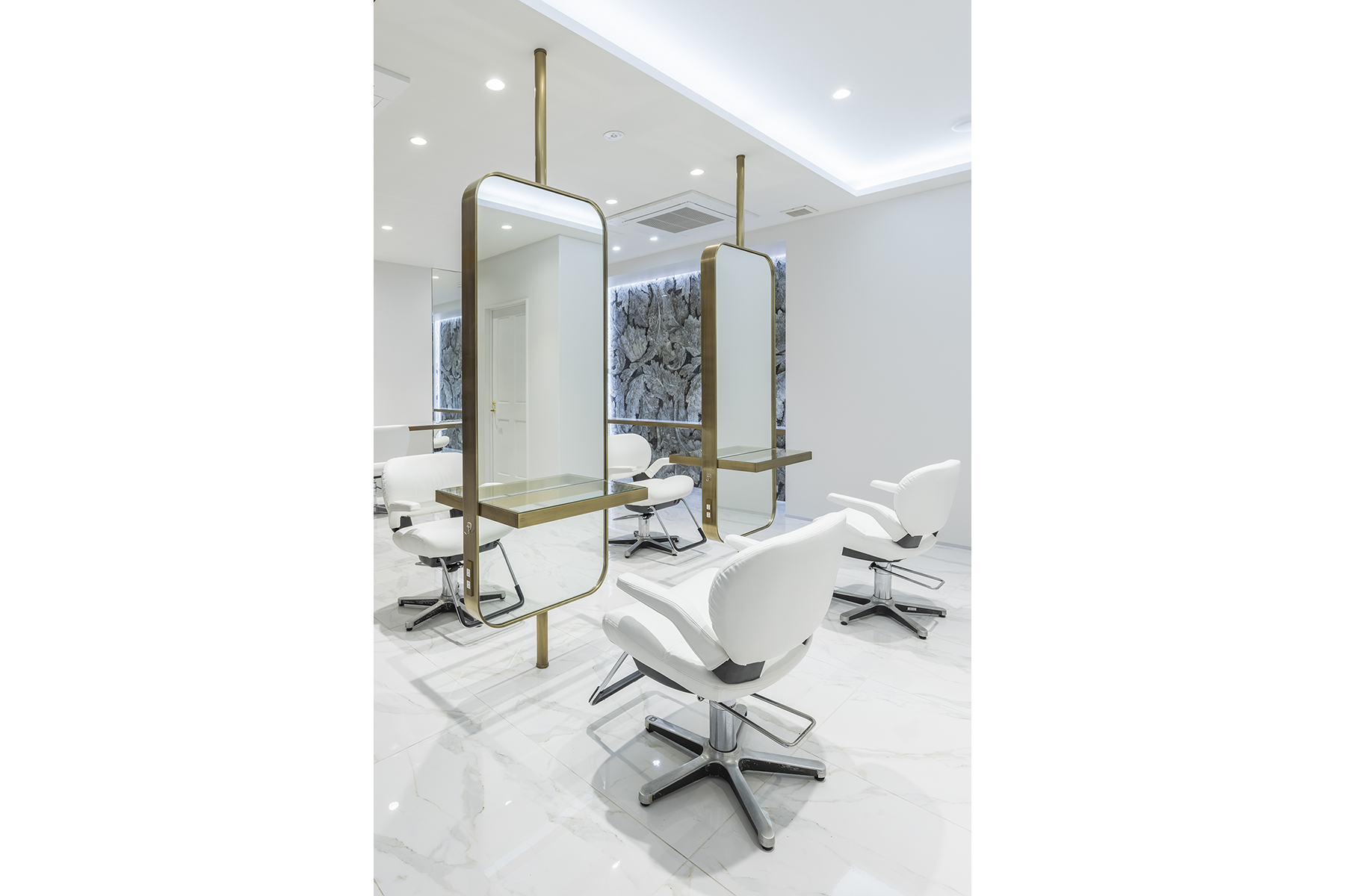 東京・神奈川で多店舗展開されている美容室の全面改装デザイン。オーナー様から頂いたコンセプトは『Favorite Spot ‐お気に入りの場所』というものでした。アプローチ壁面には天然石、店内1階には大判大理石やゴールド、印象的なレリーフを使用。外光に連動した色温度に自動調光できるシステムを使用することで解放感があり居心地のいいリゾートホテルのような空間を目指しました。