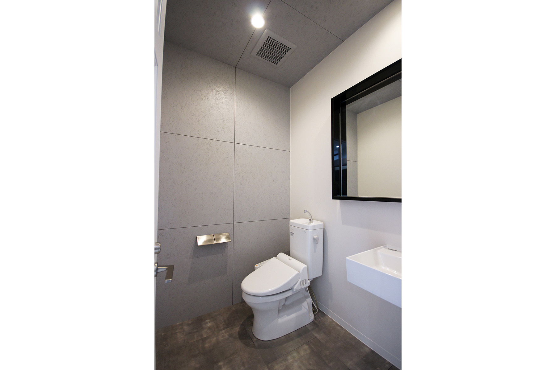 2店舗目として出店される美容室の居抜き改修デザイン。オーナー様からのイメージワードは『無機質・モノトーン・ハードな素材感』というものでした。床は糊跡の残るモルタル、壁をグレーとブラックに塗ったOSB材にすることでモノトーンに纏めながらもラフな質感を残し冷たくなり過ぎない雰囲気の空間を目指しました。