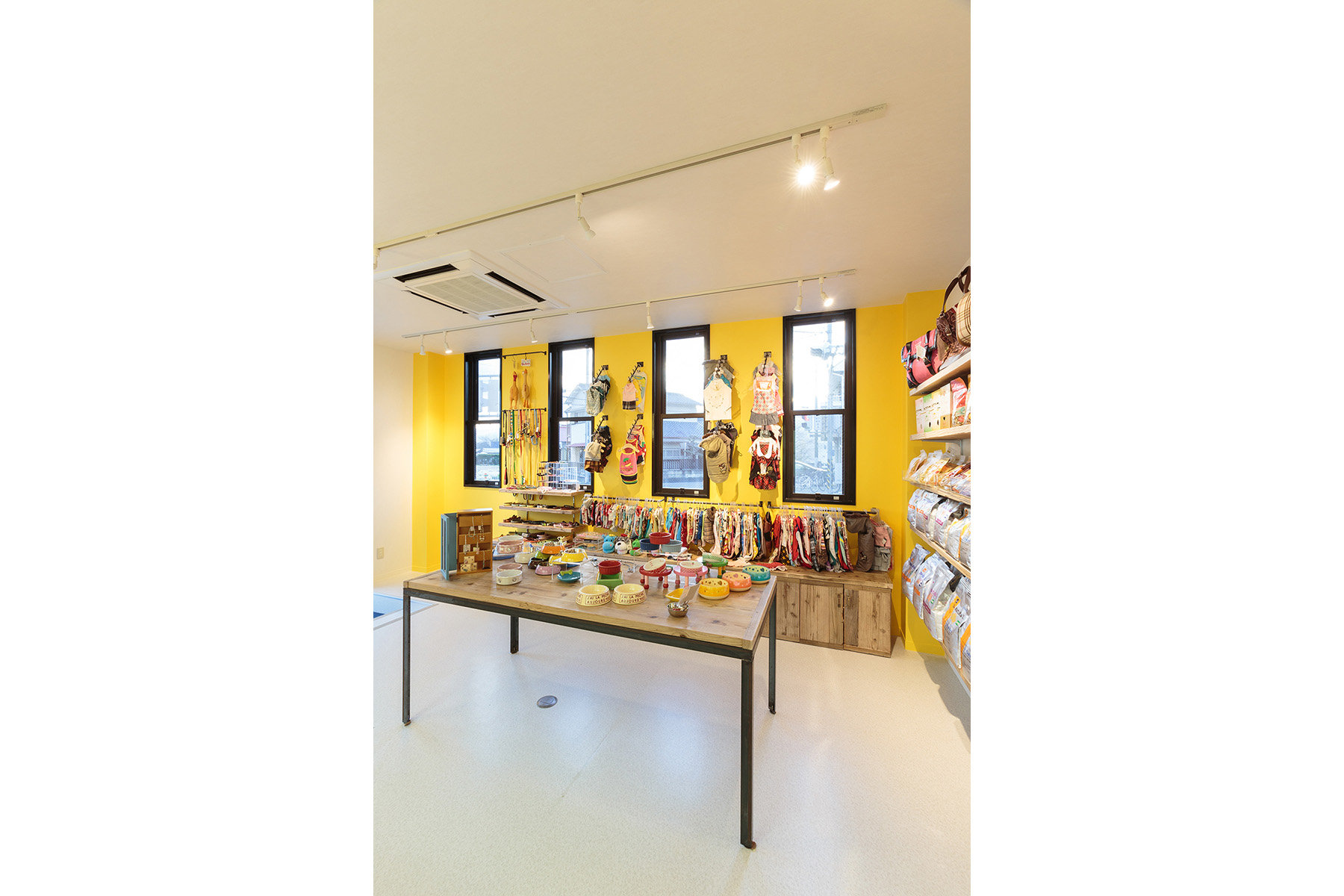 一軒家をリノベーションしトリミングサロン&グッズショップの店舗併用住宅デザイン。ショップスペースには印象的な黄色の壁と中古足場板や構造用合板などラフな質感の素材を組み合わせ、お客様の大切なペットを安心して預けていただける明るく優しい空間を目指しました。