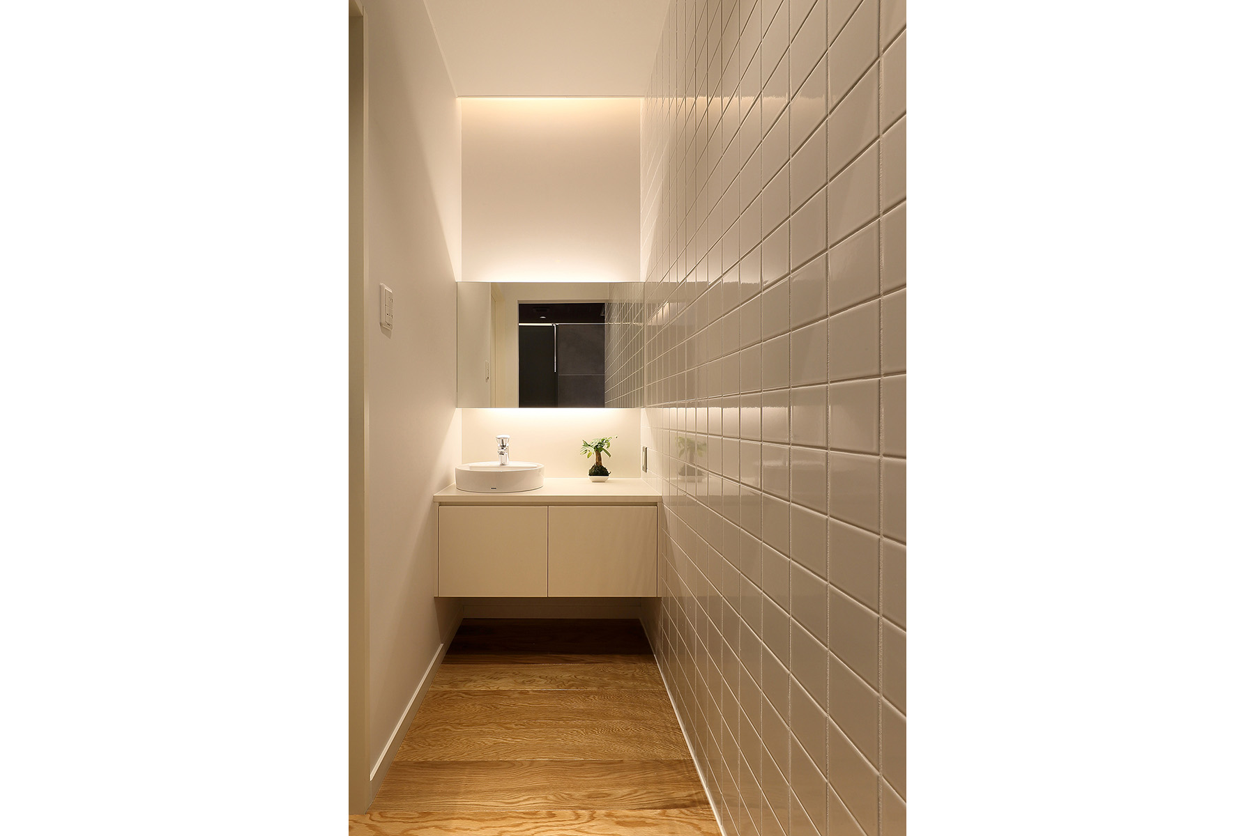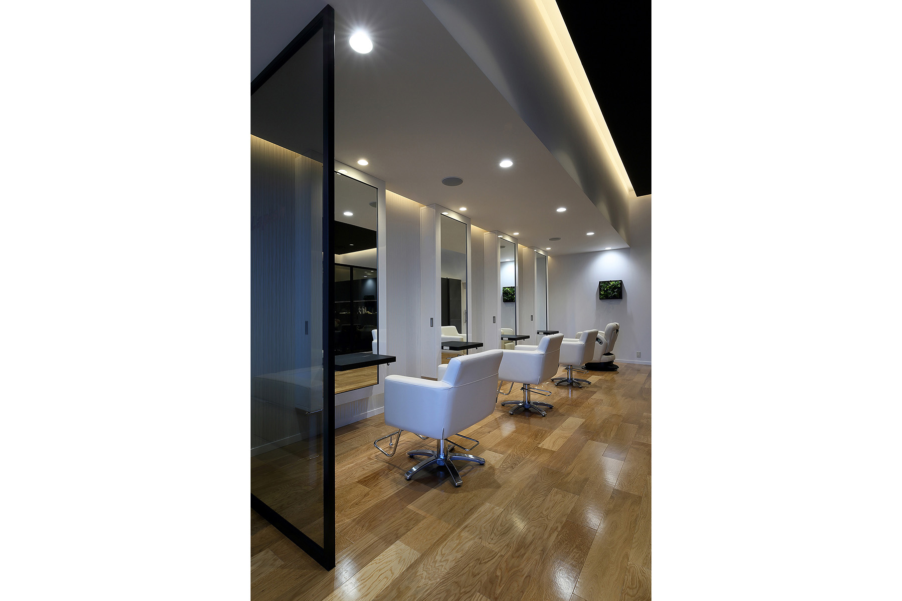 山形で多店舗展開されている美容室の新装デザイン。オーナー様からの要望は『長年使ってもずっと綺麗な状態を保てるようなお店』にしてほしいというものでした。モノトーンを基調としシンメトリーな配置とすることでスッキリとモダンな空間を目指しました。また見た目の良さだけでなく耐久性やメンテナンス性に拘った素材を使い、乱雑になりやすい小物も綺麗に整理出来る収納量を確保しています。